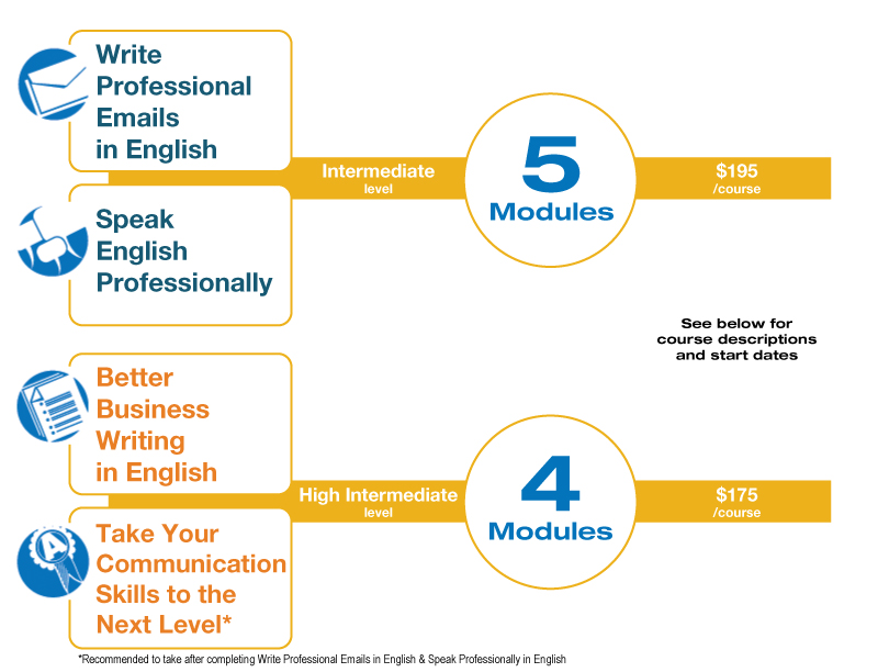 The Language Institute currently has 4 online courses to help you improve your professional communication in English for successful business interactions. Each course focuses on a particular area of communication in English and consist of 4-5 modules. Each module should take you no more than a week to complete.
